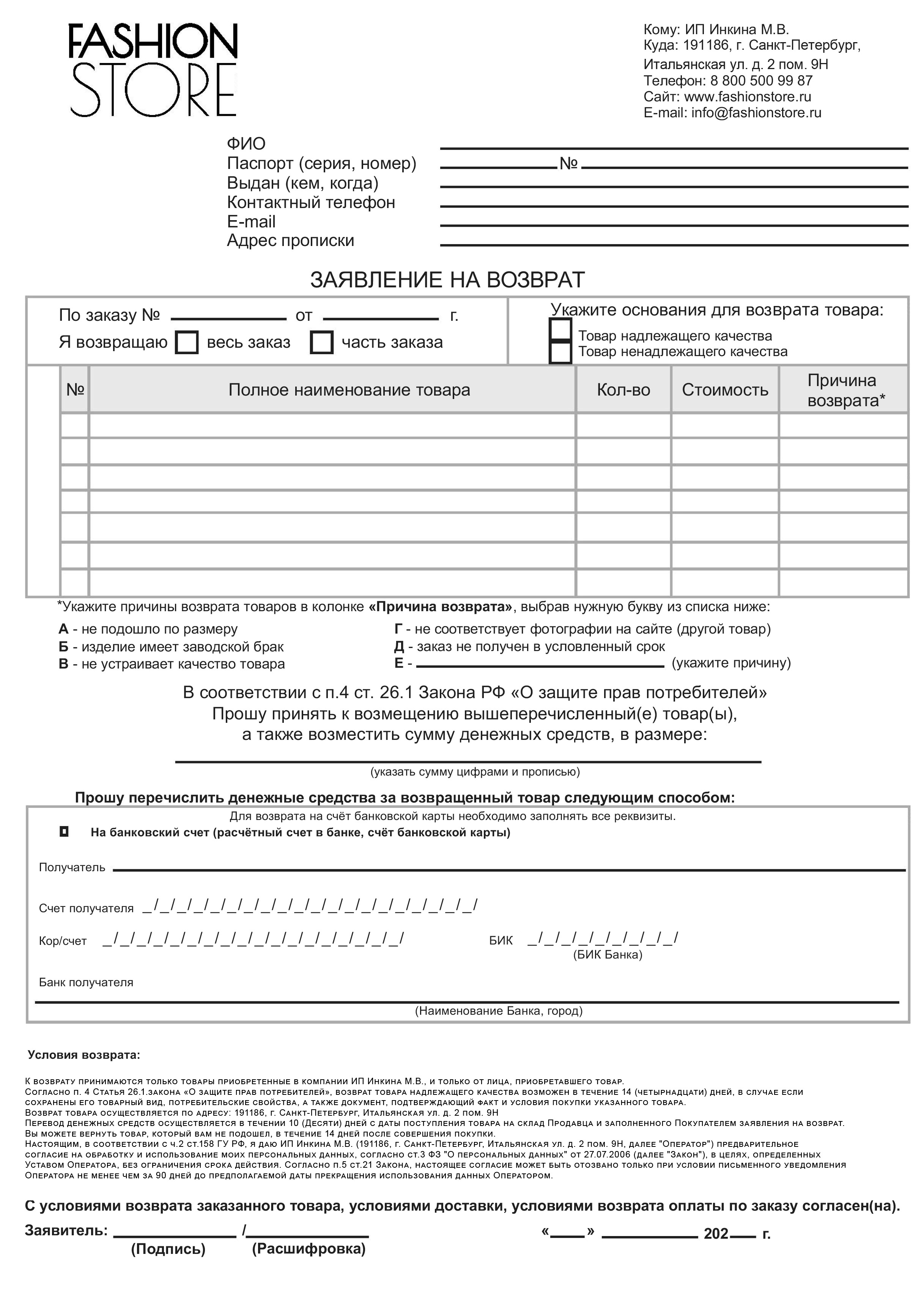 При оформлении процедуры возврата необходимо написать заявление о возврате или обмене с указанием личных паспортных данных. Возврат/обмен будет осуществлен в течение 10 рабочих дней.