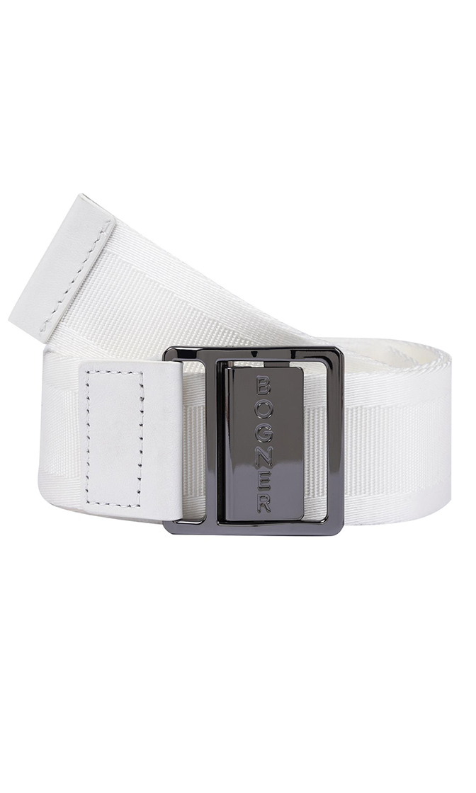 - Прямоугольная металлическая пряжка-зажим с тиснением логотипа BOGNER и кожаной отделкой