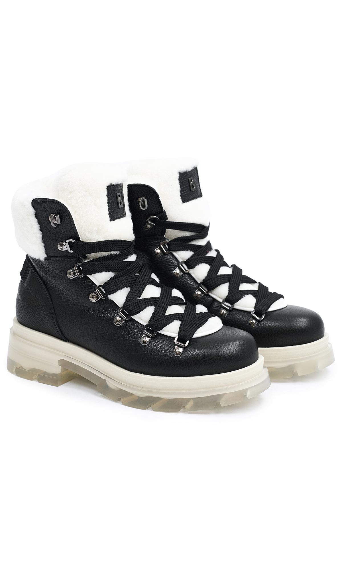 Черные ботинки выполнены на основе натуральной кожи. Дополнены контрастной меховой отделкой внутри и снаружи, шнуровкой и рельефной резиновой подошвой. Логотип добавляет фирменный акцент. Стильные и теплые ботинки.