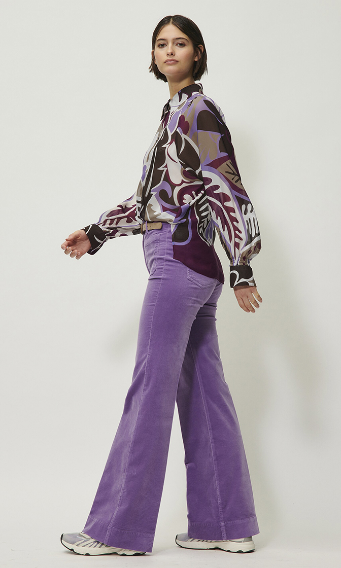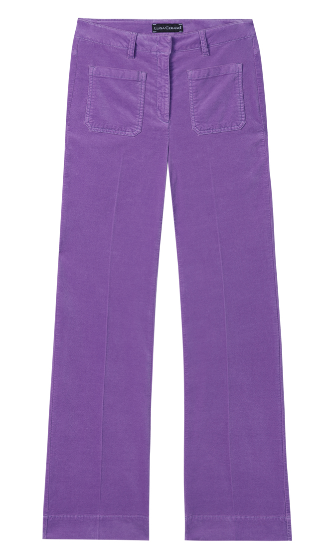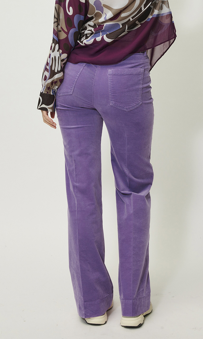 Фиолетовые расклешенные брюки выполнены на основе натурального хлопка и экологически чистого модала. Мягкий материал отлично пропускает воздух и впитывает влагу. Брюки дополнены шлевками для ремня, передними и задними накладными карманами и элегантными стрелками.