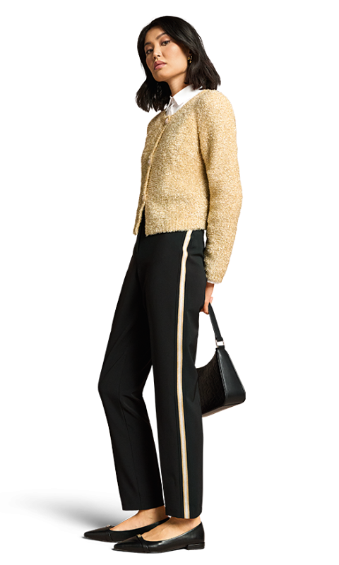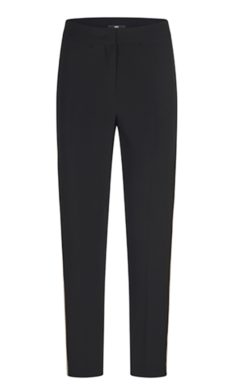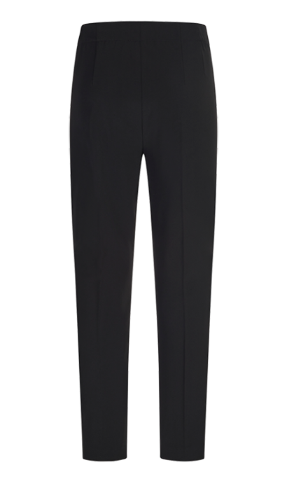 Черные брюки выполнены из мягкой и эластичной ткани. Дополнены потайной молнией и лампасами по бокам. Такие базовые брюки станут основой множества элегантных образов.