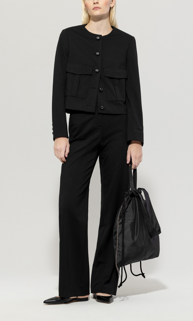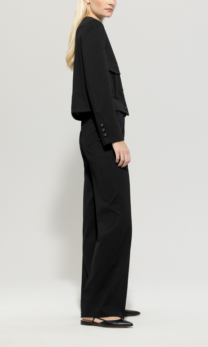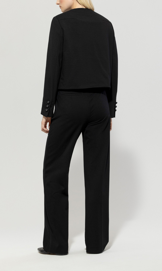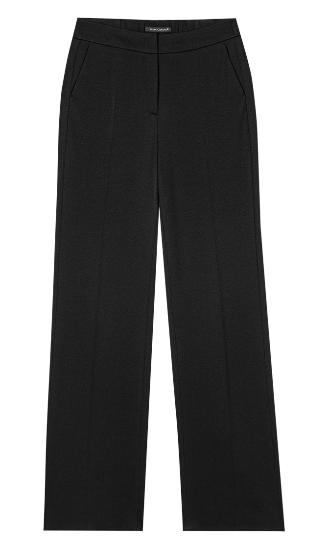 Широкие черные брюки прямого кроя выполнены из эластичной ткани на основе вискозы. Дополнены поясом, прорезными карманами и элегантными стрелками. Идеальные базовые брюки для создания самых разных повседневных образов.
