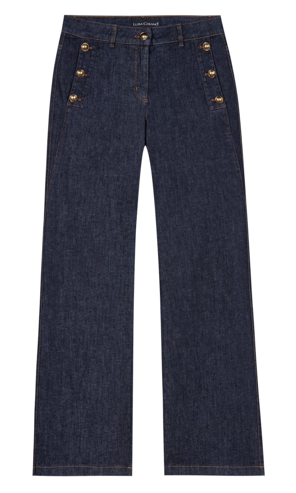 Синие джинсы выполнены из натурального хлопка с добавлением эластана. Дополнены поясом со шлевками для ремня, прорезными карманами с акцентными пуговицами и потертостями на брючинах. Джинсы расклешенного кроя отлично подойдут для создания стильных повседневных образов.