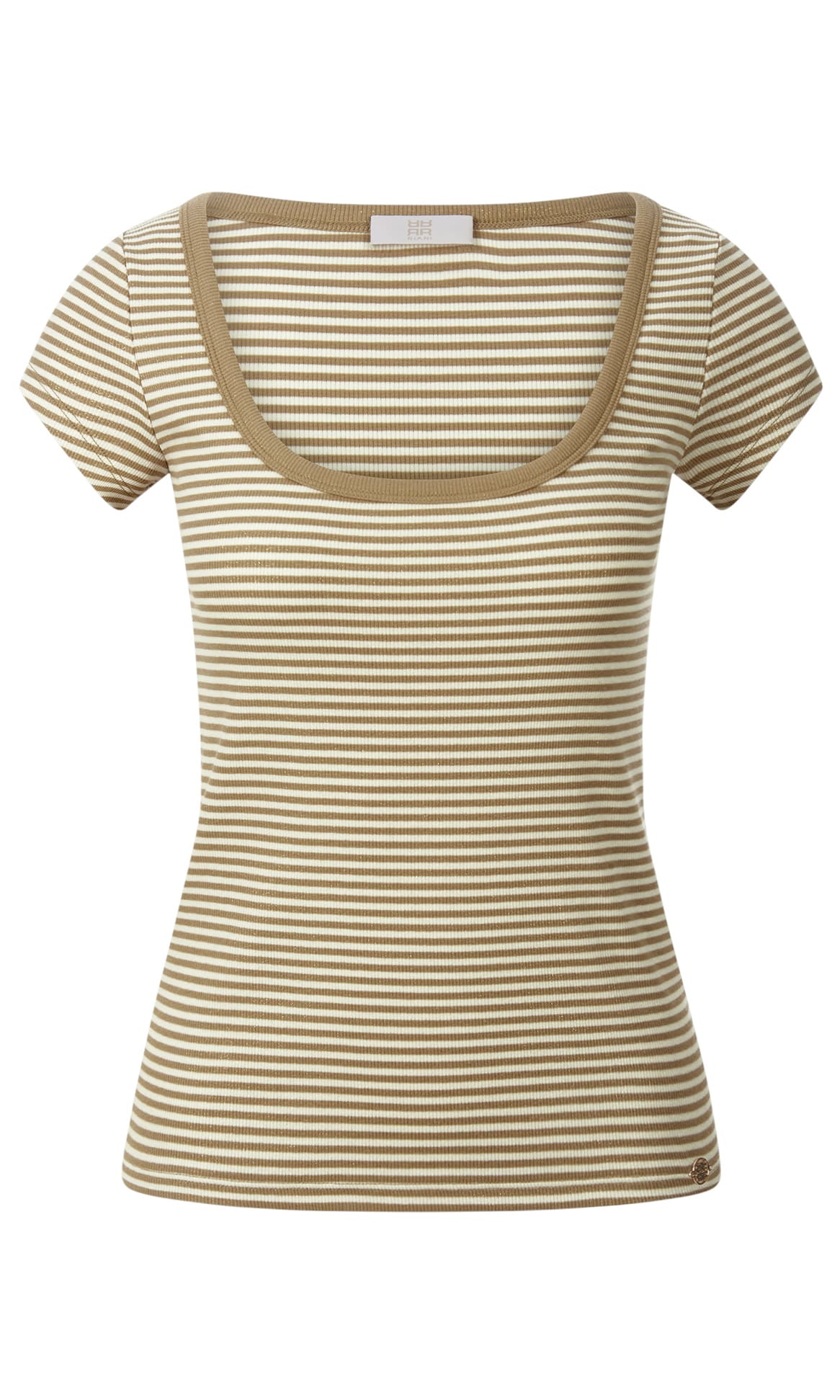 Бежевая футболка в полоску выполнена из ткани в рубчик на основе натурального хлопка. Дополнена глубоким округлым вырезом и короткими рукавами. Стильная базовая футболка на каждый день.