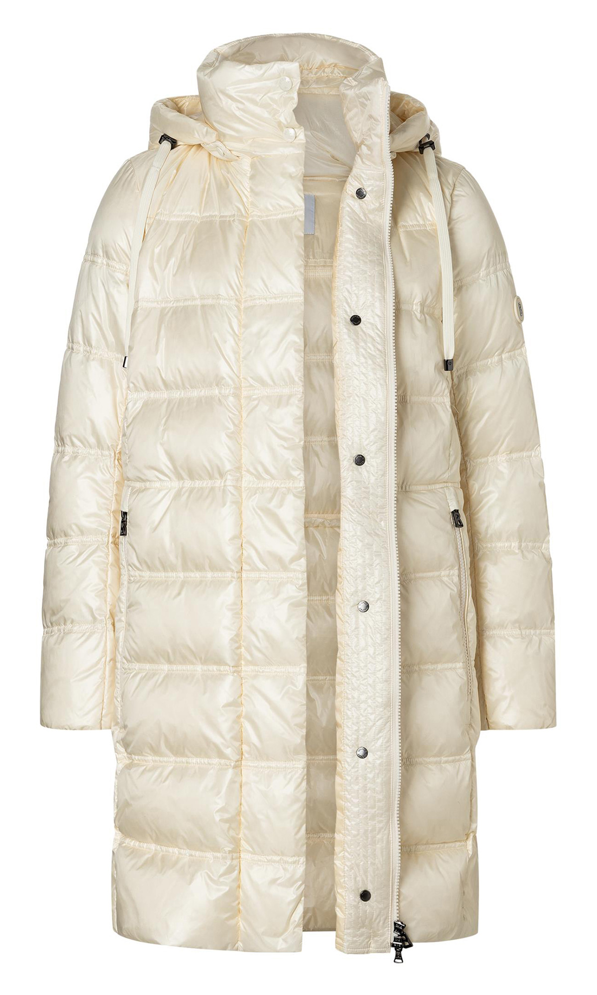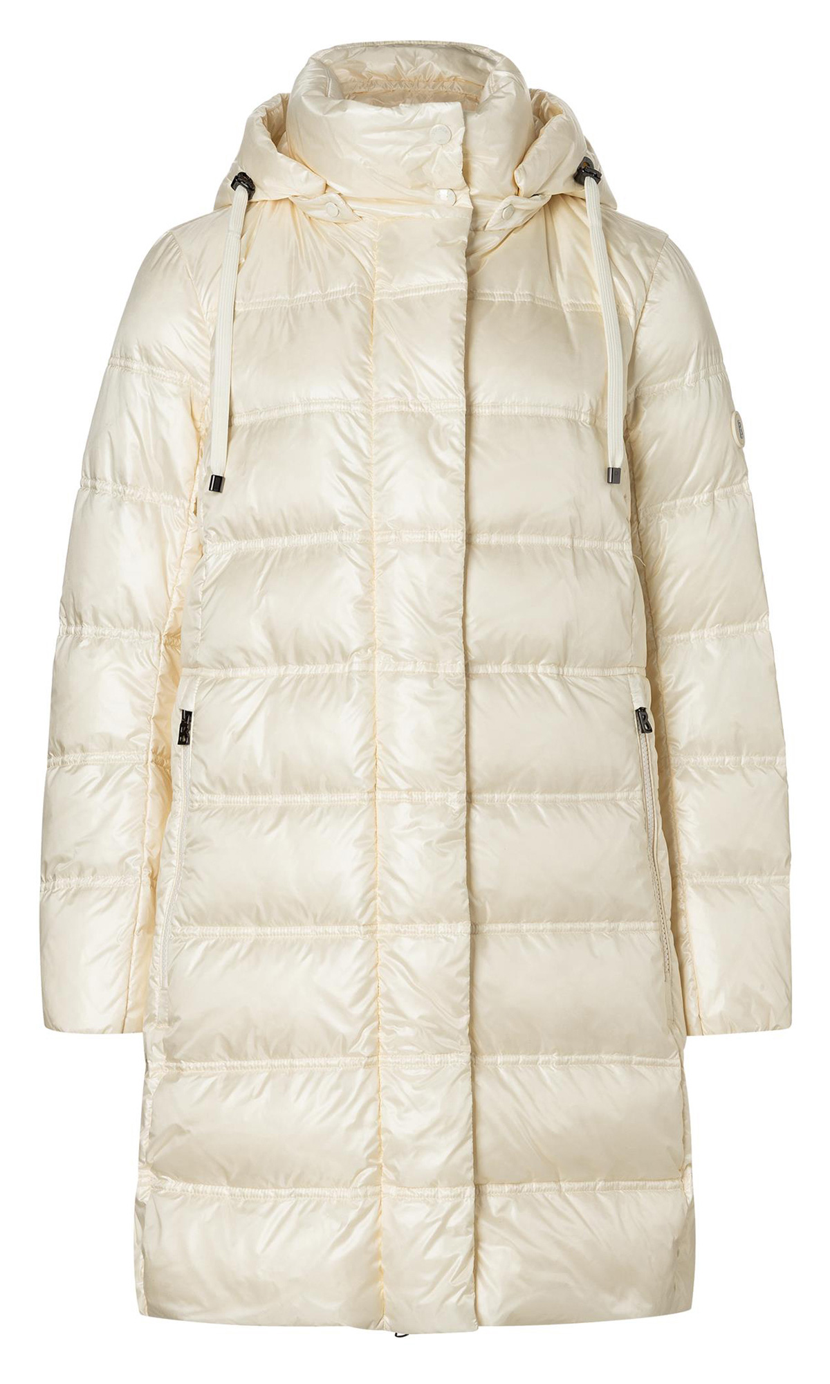 Пуховик Lynn молочного оттенка выполнен из прочного стеганого материала с наполнителем из натурального утиного пуха. Дополнен воротником-стойкой с капюшоном, карманами на молнии и эластичными манжетами. Теплый и стильный пуховик.