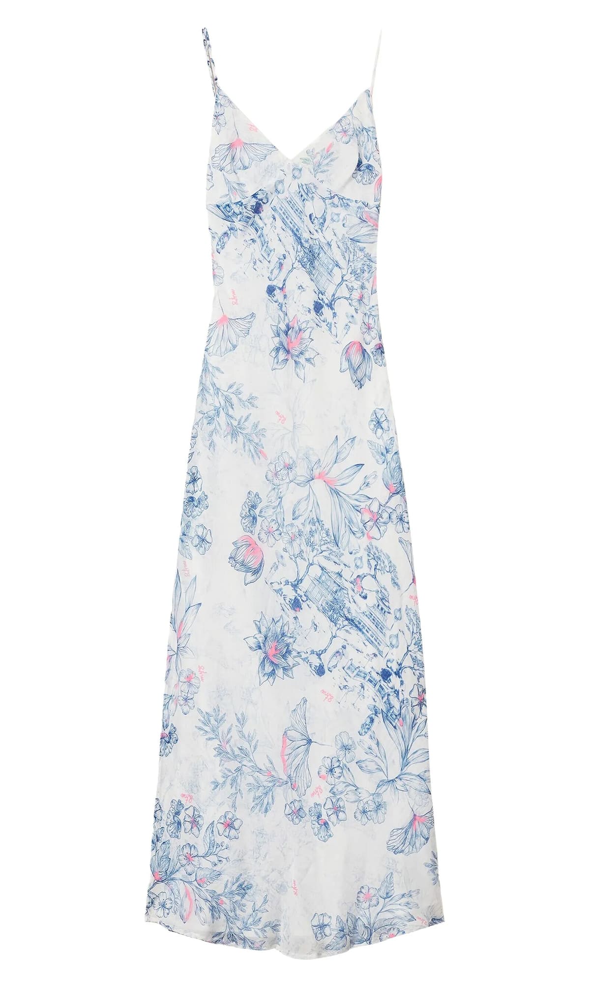 Белое платье с нежным цветочным принтом выполнено из легкой органзы. Модель прямого кроя дополнена тонкими бретелями, V-образным вырезом и открытой задней частью. Это платье идеально подойдет для создания воздушного летнего образа.