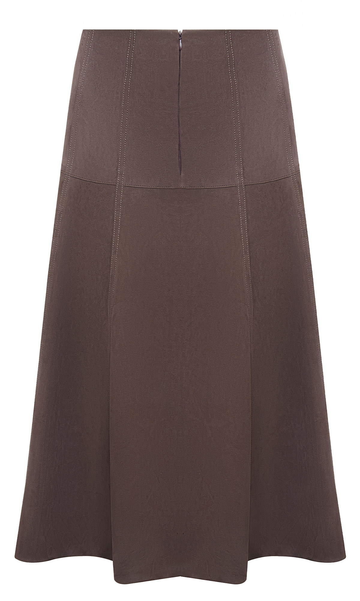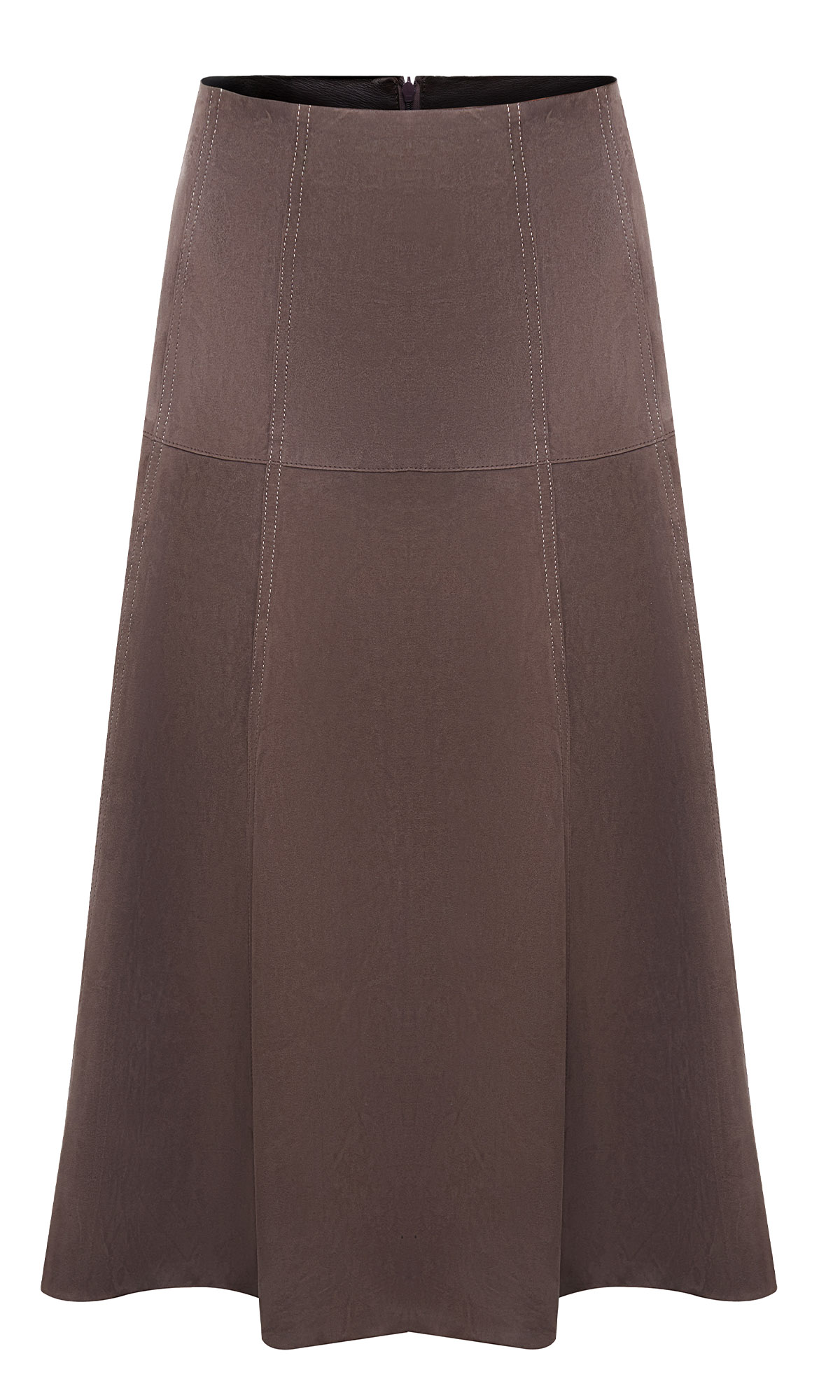 Коричневая трапециевидная юбка выполнена из натуральной мягкой замши. Дополнена декоративной строчкой и молнией сзади, а также легкими воланами по подолу. Элегантная юбка для роскошных женственных образов.