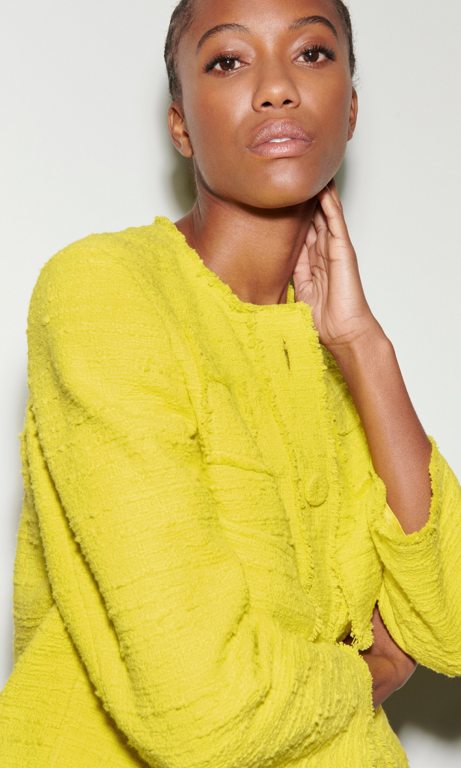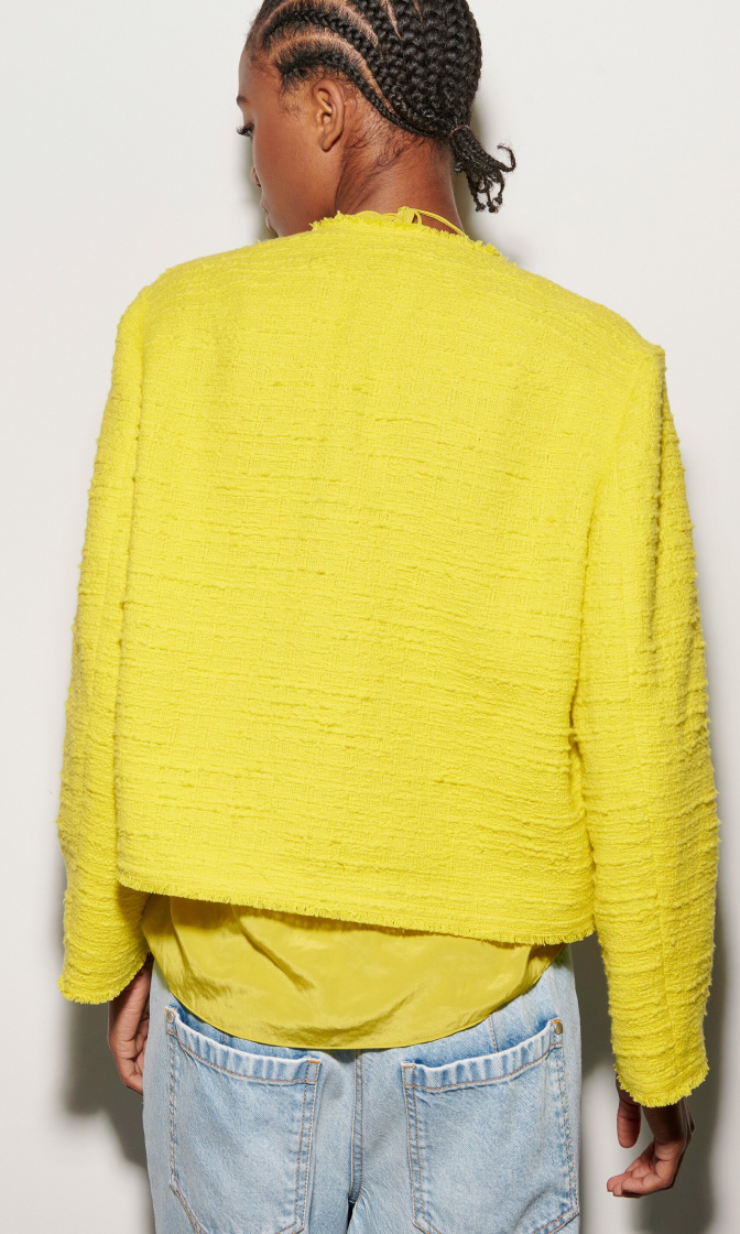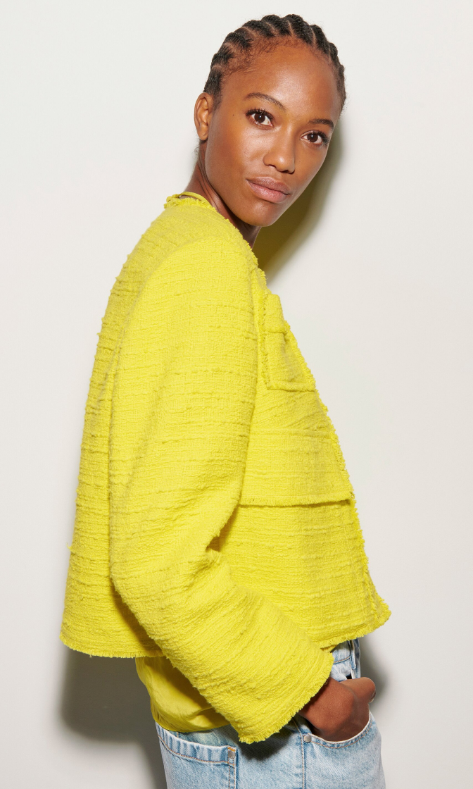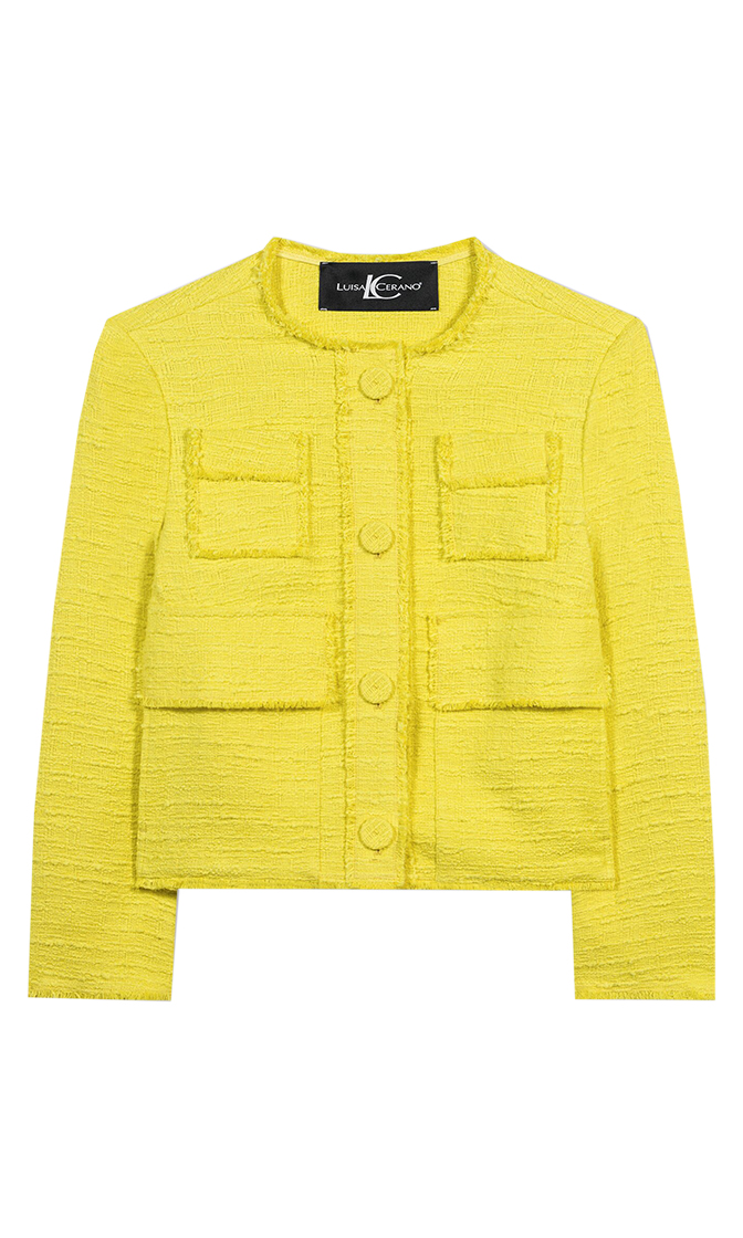 Желтый жакет выполнен из твидовой ткани на основе натурального хлопка. Изделие без воротника дополнено накладными карманами с клапанами и необработанными краями. Застегивается на пуговицы. Такой изящный и яркий жакет идеально дополнит стильные весенне-летние образы.