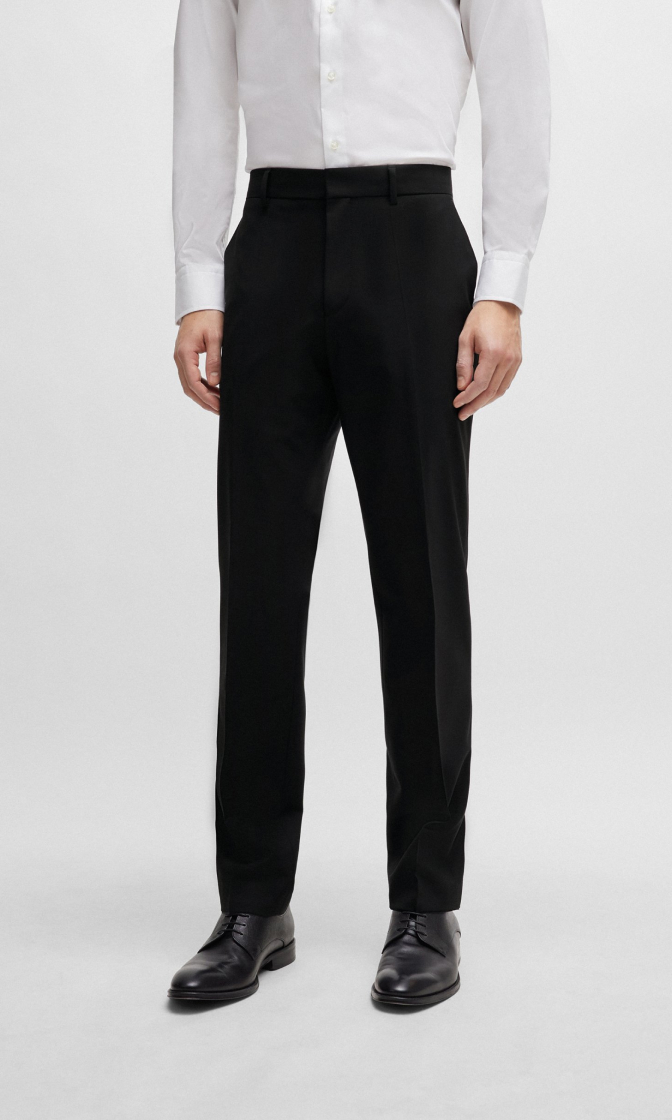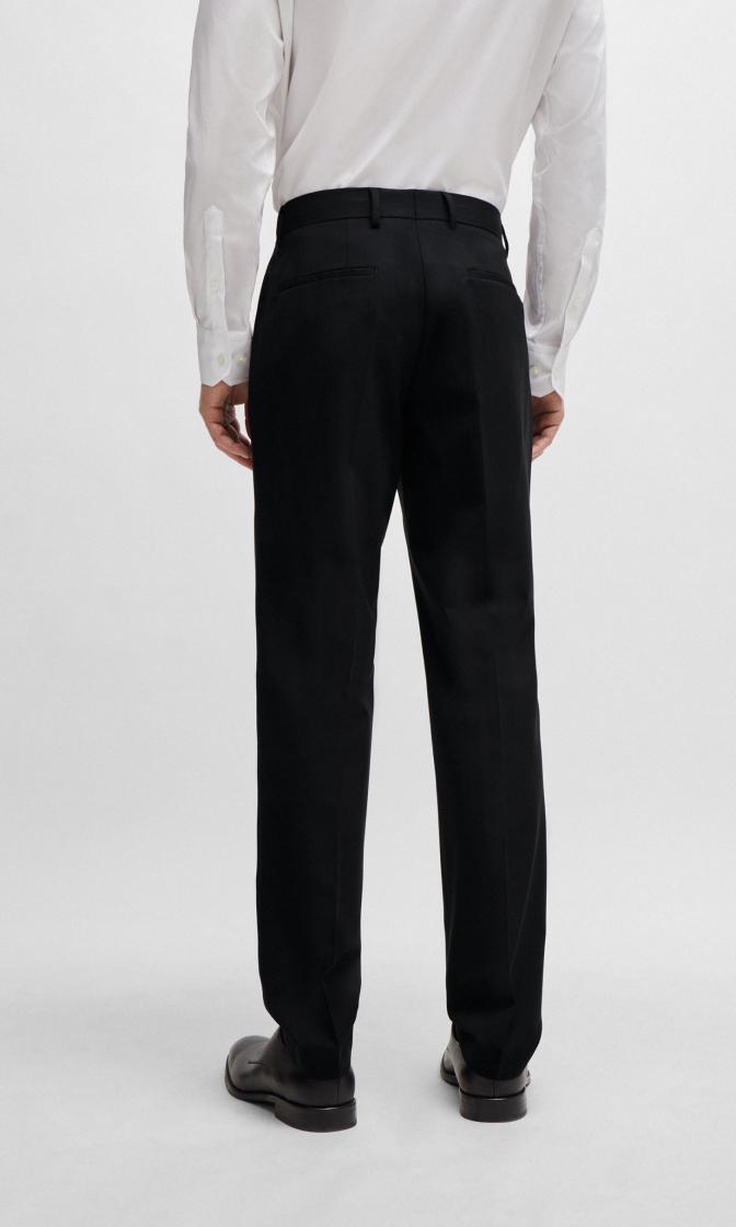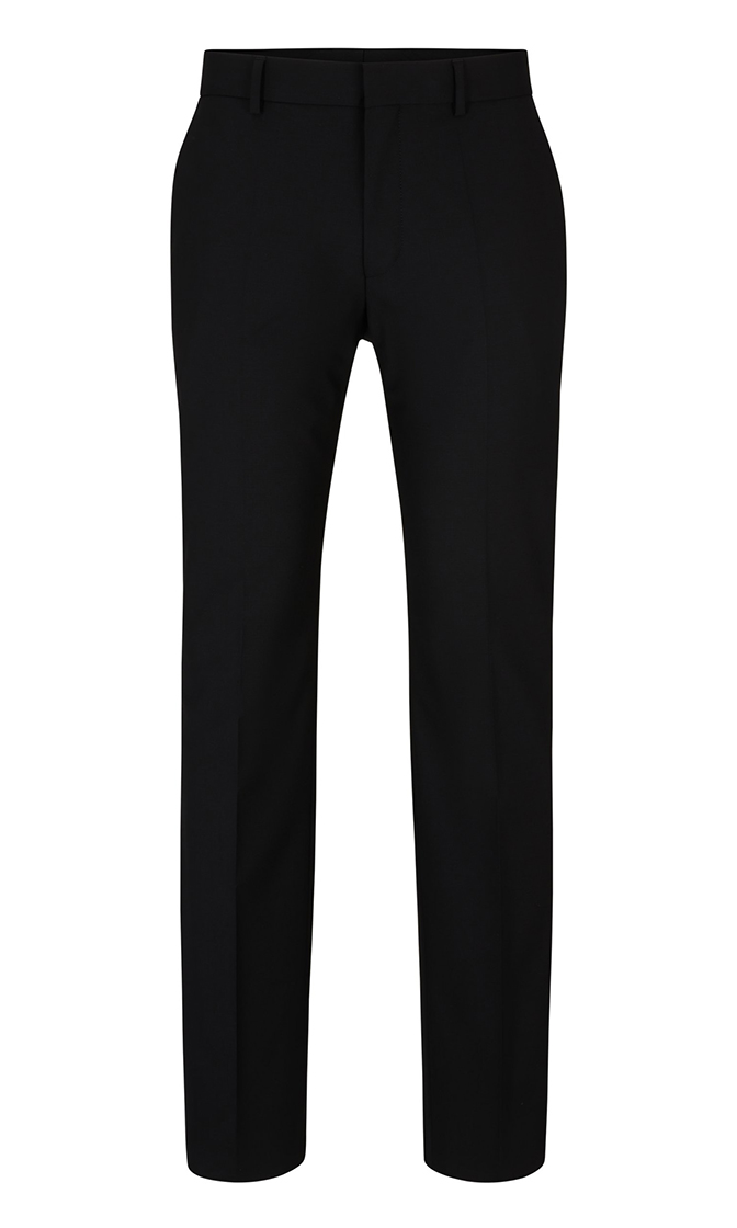 Черные прямые брюки выполнены из натуральной шерсти с добавлением эластана. Дополнены поясом со шлевками для ремня, карманами и элегантными стрелками на брючинах. Такие строгие брюки отлично впишутся в деловые образы.